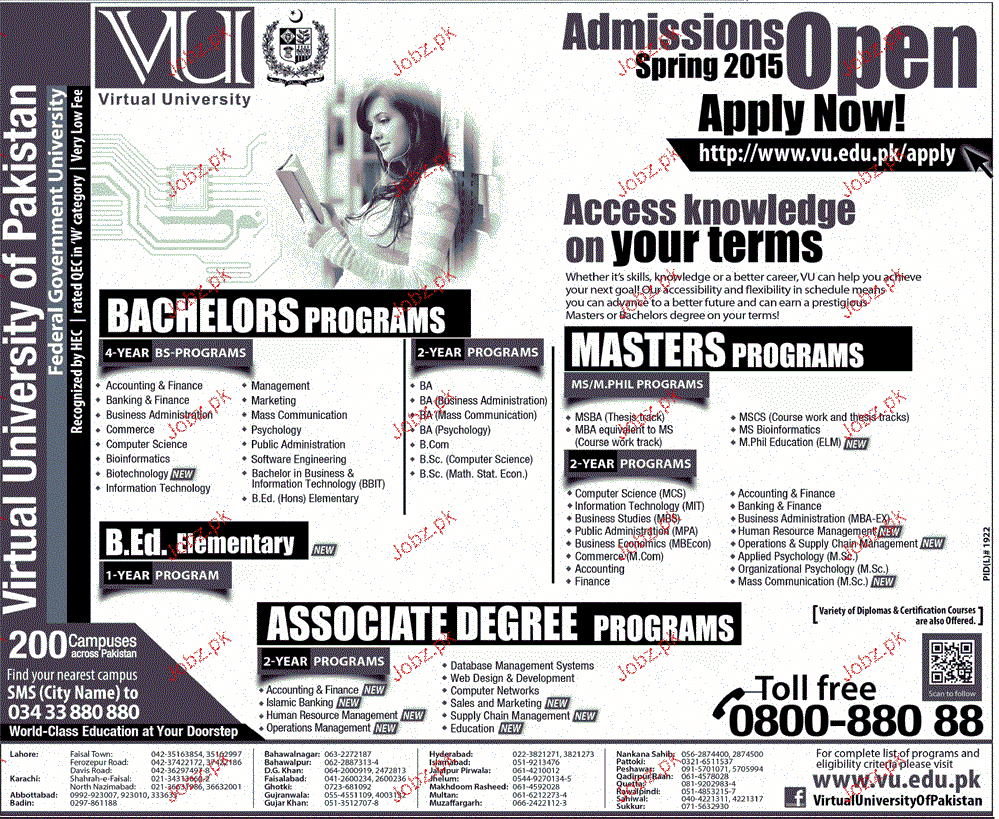 Virtual University of Pakistan Admission in B.Sc, BA, B.Com and MA in Lahore. Read newspaper ad for exact details.