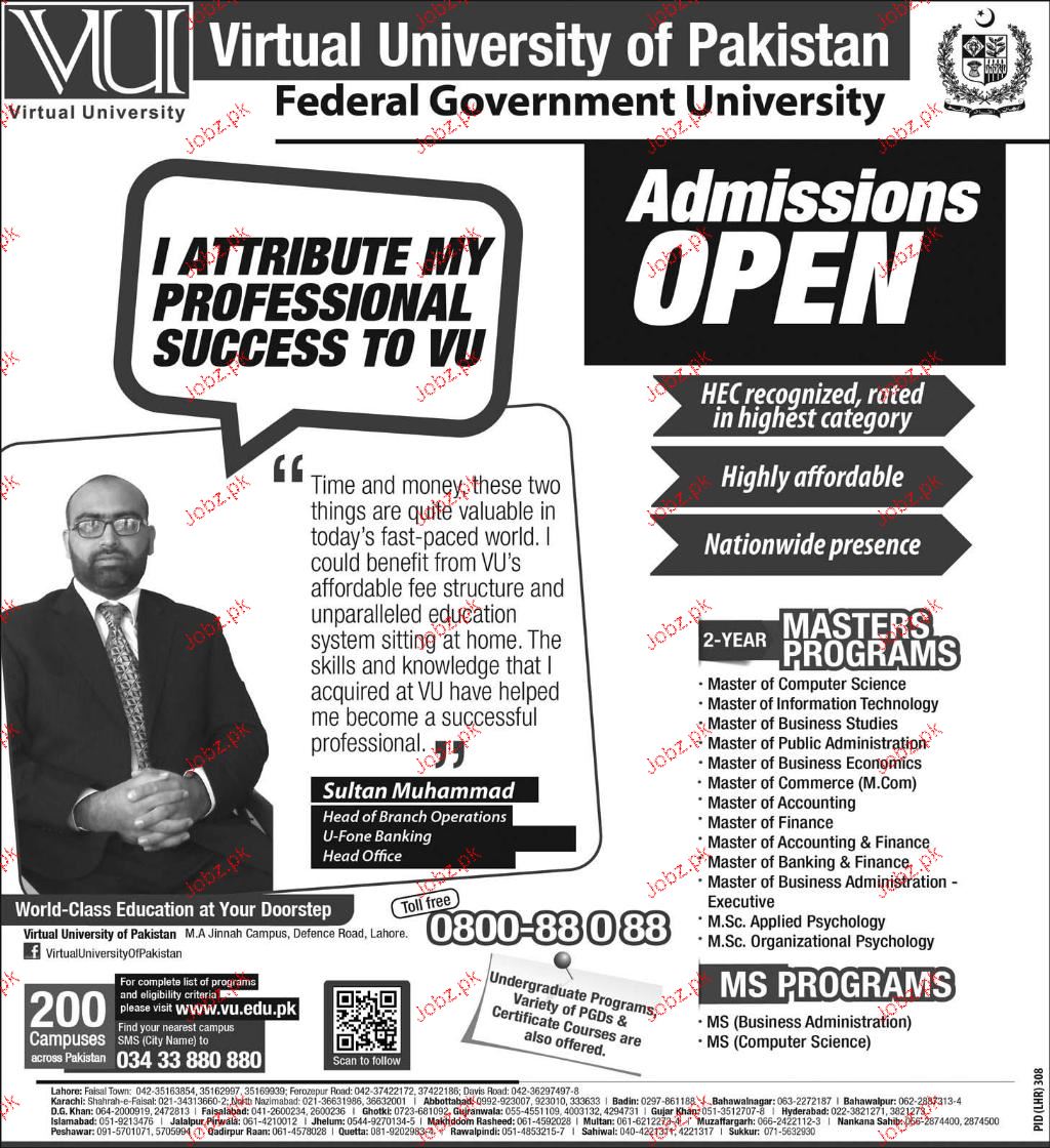 Virtual University of Pakistan Admission in MA and MS in Lahore. Read newspaper ad for exact details.