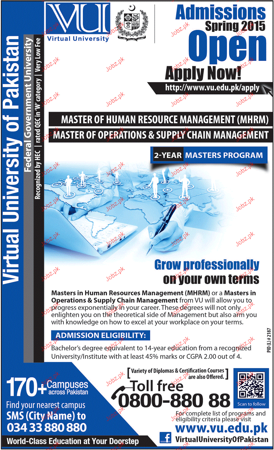 Virtual University of Pakistan Admission in MHRM in Lahore. Read newspaper ad for exact details.