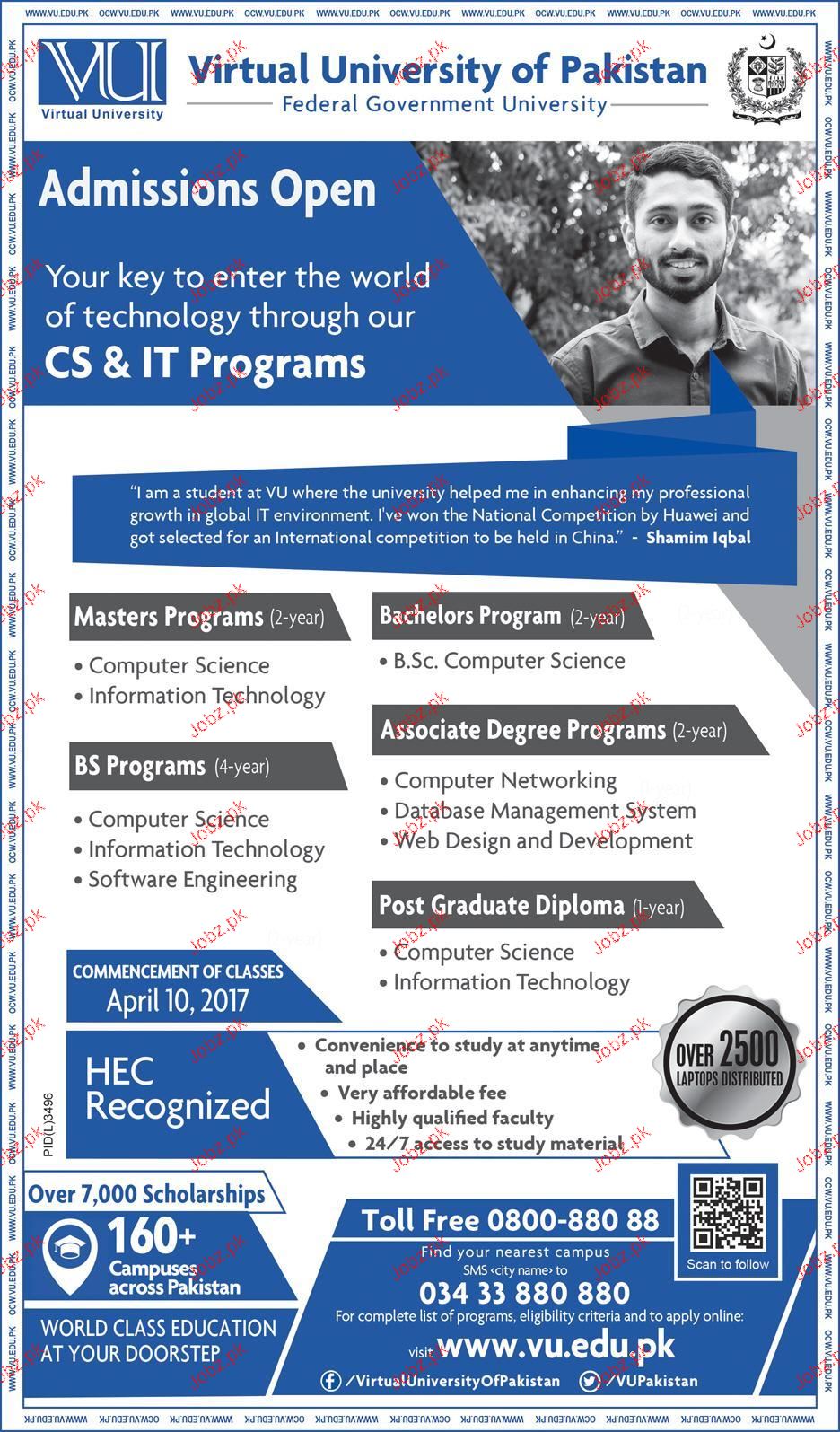 Virtual University of Pakistan Admission in MS, BS, B.Ed and DIT in Lahore. Read newspaper ad for exact details.