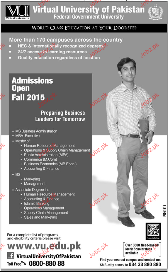 Virtual University of Pakistan Admission in MS, MBA and BS in Lahore. Read newspaper ad for exact details.