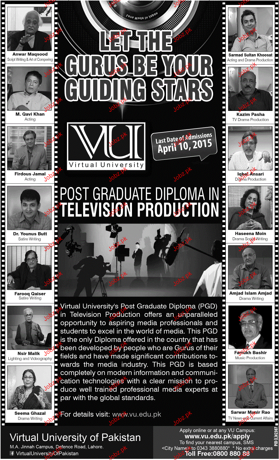 Virtual University of Pakistan Admission in PGD in Lhaore. Read newspaper ad for exact details.