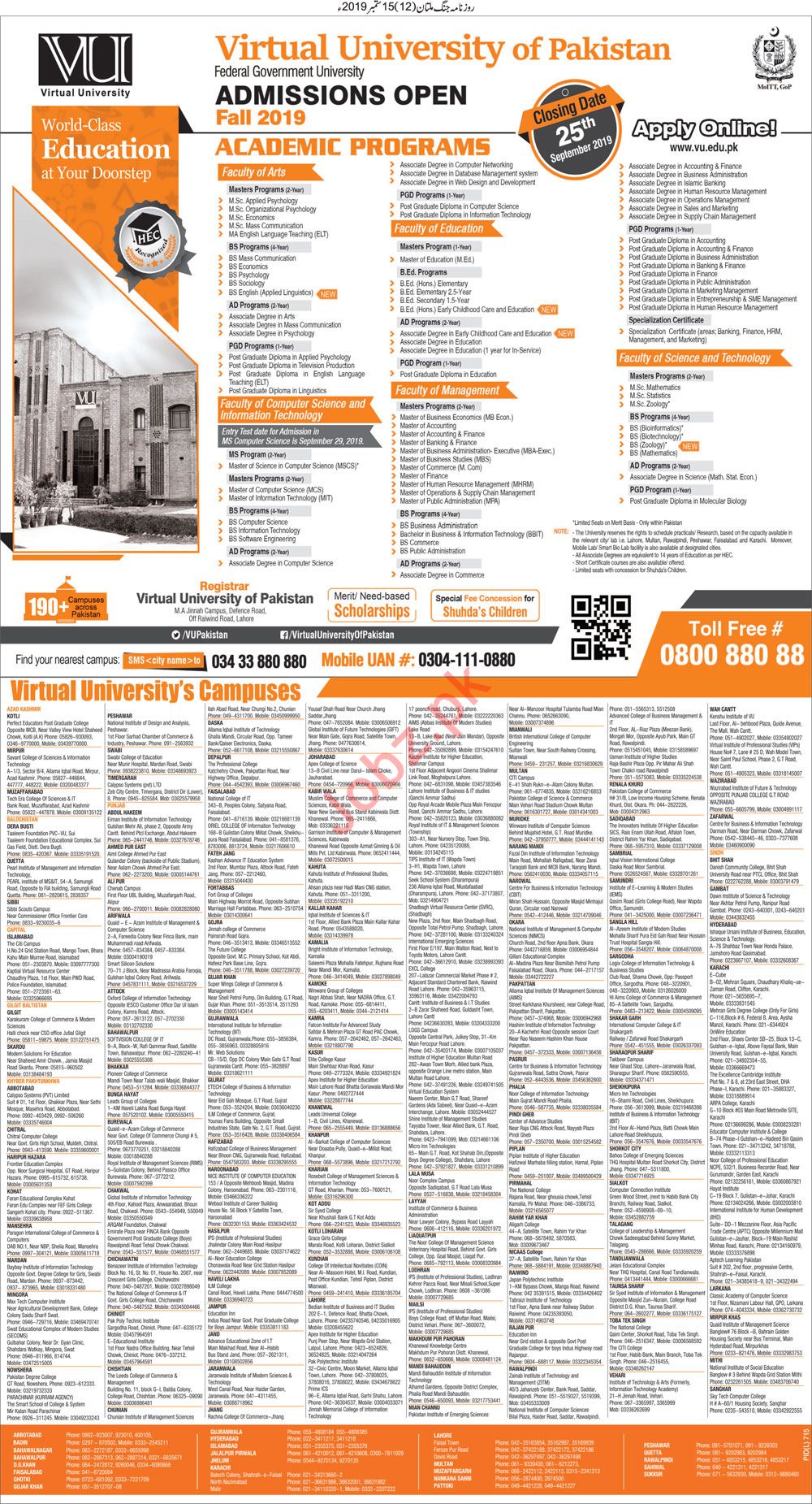 Virtual University Pakistan has announced admissions in M.Sc Applied Psychology, Economics, Mass Communication, English Language Teaching MLT, BS Mass Communication, Economics, Psychology, Sociology, English. Associate Degree in Arts, Mass communication, Psychology. Post Graduate Diploma in Applied Psychology, Television Production, English Language Teaching, MS Computer Science, BS Computer Science, BS Information Technology, BS Software Engineering, MBA, BBA in their all campuses in Pakistan. Read newspaper ad for exact details.