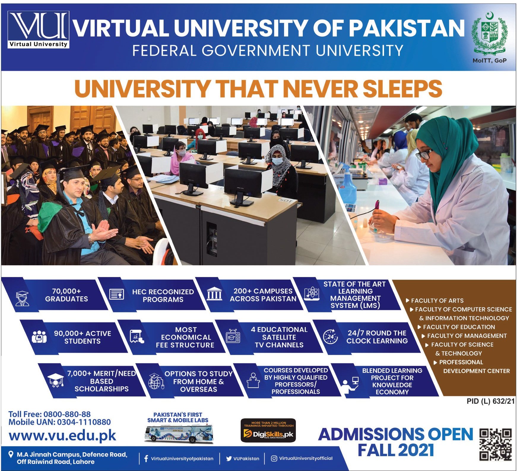 The Virtual University of Pakistan is a public sector university invites applications for admissions in Bachelors Programs and Masters Programs in Lahore Punjab Pakistan 2021. Read newspaper ad for exact details.