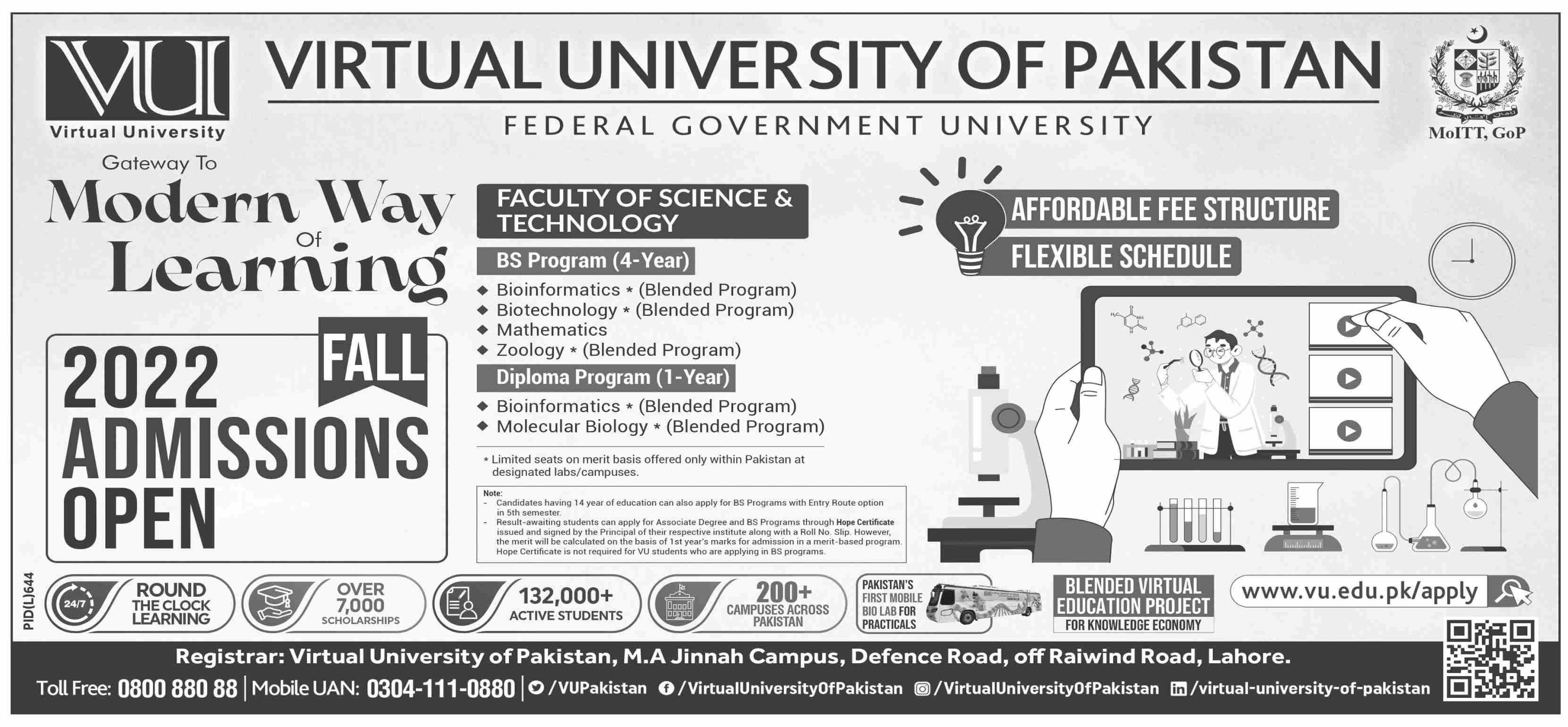 Virtual University of Pakistan Bachelor Program Bioinformatics, Biotechnology, Mathematics, Zoology. Diploma Bioinformatics, Molecular Biology. admissions 2022 has been started. Students who want to take admissions in Virtual University of Pakistan Lahore Punjab Pakistan for academic year 2022 to continue education in Teaching University can apply. Eligible students for fulfilling criteria for admissions in BS, Bachelor and Diploma can enroll as per Government admission policy 2022 till closing date 20 September 2022. Read newspaper ad for exact details.