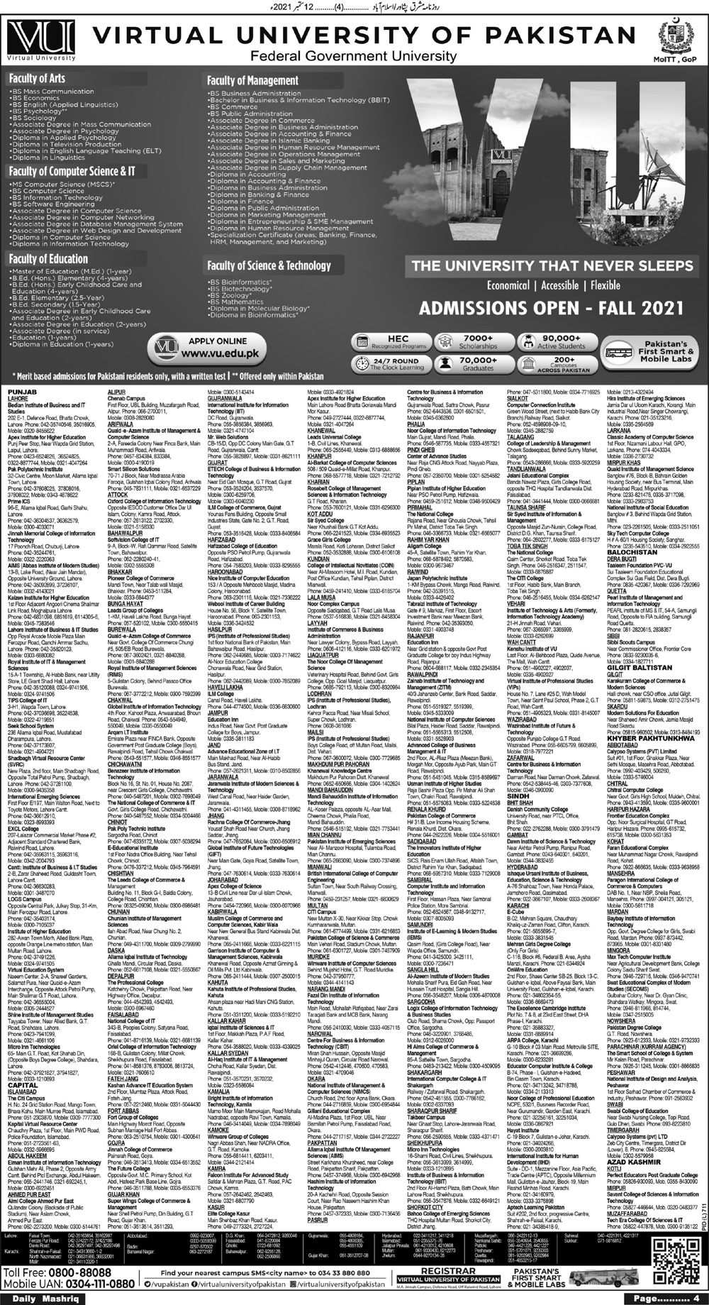 The Virtual University of Pakistan is a public sector university invites applications for admissions in BS, ADP, Diploma, MS and B.Ed Hons degree programs 2021. Read newspaper ad for exact details.