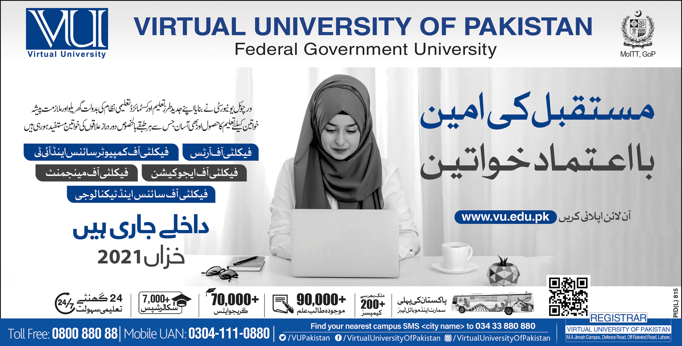 Virtual University of Pakistan is a public sector university invites applications for online admissions in Undergraduate Programs and Graduate Programs in Lahore Punjab Pakistan 2021. Read newspaper ad for exact details.
