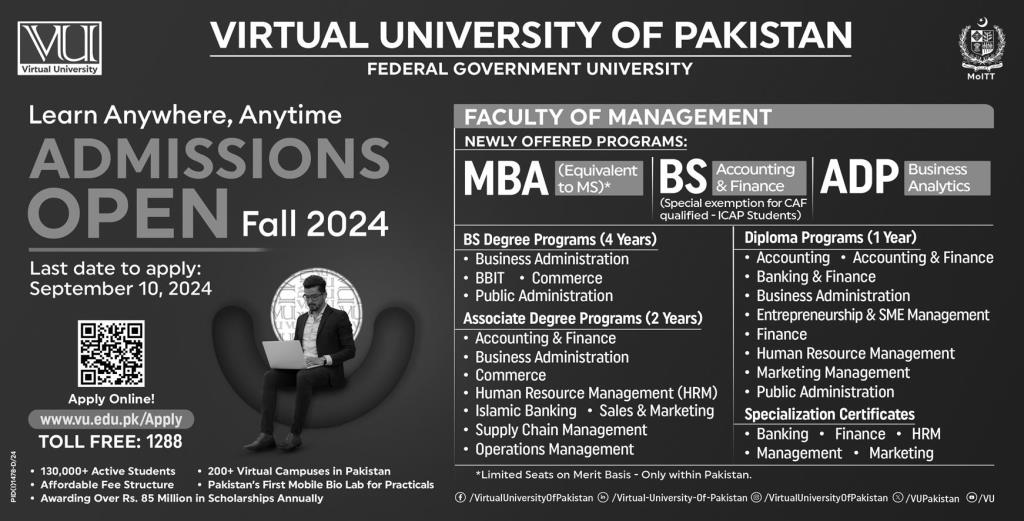Virtual University of Pakistan has announced admissions 2024 for Business Administration, Accounting & Finance, Public Administration, Human Resource Management, Commerce, Banking & Finance . Eligible students who qualify as per admission criteria in Virtual University of Pakistan Islamabad Karachi Islamabad Pakistan can apply in Teaching University for academic year 2024. Students who want to enroll for academic session 2024 in MBA, ADP, Diploma and BS qualification and admission criteria for Government institute can apply till last date 20 September 2024. Read newspaper ad for exact details.