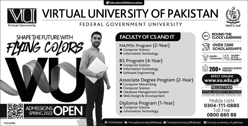Admissions in Virtual University of Pakistan 2022 for MA Computer Science, MSc Computer Science, MA Information Technology, MSc Information Technology, BS Computer Science, BSCS, BSIT, BS Information Technology, BS Software Engineering, Associate Degree Program, Associate Degree in Computer Networking, Associate Degree in Computer Science, Associate Degree Database Management System, Associate Degree in Web Design & Development, 1 Year Diploma Program, Diploma in Computer Science, Diploma in Information Technology, DIT has been announced. Eligible students who qualify as per admission criteria in Virtual University of Pakistan Lahore Punjab Pakistan can apply in IT University for academic year 2022. Eligible candidates for admissions in BS, DIT, Master and Bachelor can apply as per Government institute criteria and before closing date 24 April 2022 after reading advertisement online. Read newspaper ad for exact details.