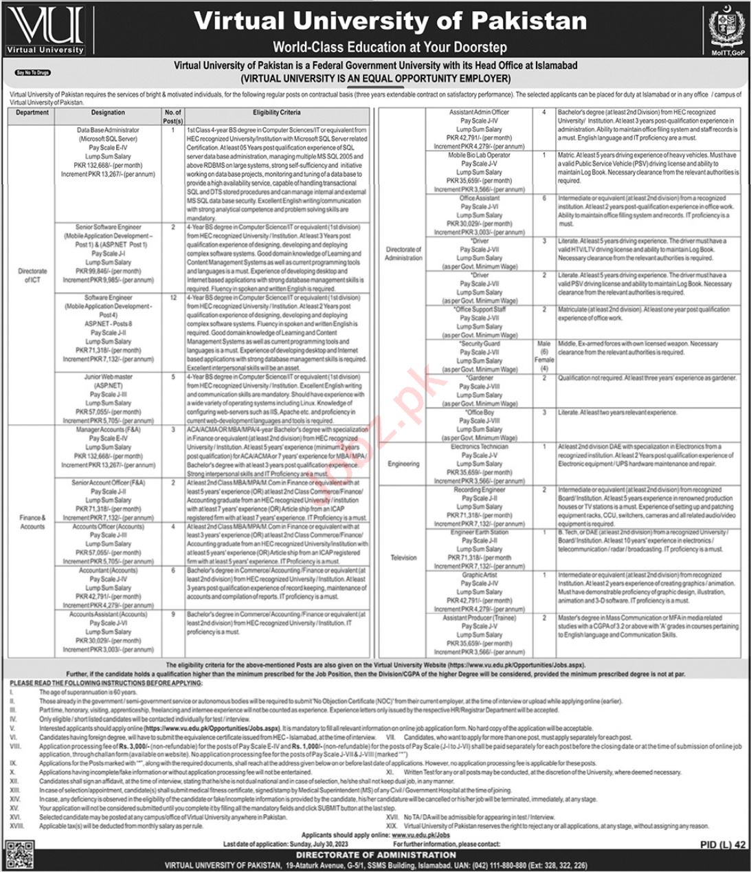 Virtual University of Pakistan jobs advertisement dated about 09 July 2023 in daily Jang Newspaper invites application for the vacant post of account officer fa, security guard, mobile bio lab operator, account assistant, web master aspdotnet, office support staff, graphic artist, assistant producer, software engineer mobile application development, manager account fa, engineer earth station, recording engineer, account office account, office boy, software engineer mobile application development asp, assistant admin officer, accountant, gardener, data base administrator, driver, driver i, electronics technician, office assistant and software engineer in Lahore, lahore Punjab Pakistan. BIT, MA, Master, M.sc, BBA, BA, MIT, Bachelor and MBA etc. educational qualification will be preferred.