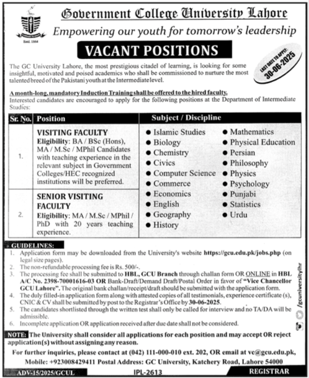 Government College University invites applications for job positions advertised in daily Jang dated 15 June 2025 for following vacancies in Lahore, lahore Punjab Pakistan.