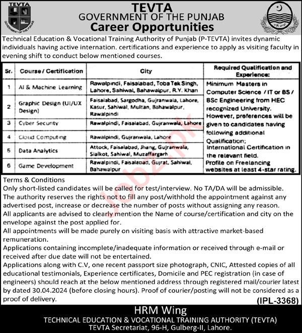 Technical Education & Vocational Training Authority TEVTA jobs advertisement dated about 21 April 2024 in daily Nawaiwaqt Newspaper invites application for the vacant post of lecturer data analytics, visiting faculty, lecturer cloud computing, lecturer cyber security, lecturer ai machine learning, lecturer, lecturer game development and lecturer graphic design in Rawalpindi, sialkot, muzaffargarh, kasur, rahim yar khan, rawalpindi, toba tek singh, jhang, sahiwal, faisalabad, lahore, bahawalpur, attock, gujranwala, multan and sargodha Punjab Pakistan. Persons with BIT, Others, B.E, BCS, Master and Intermediate etc. education can apply.