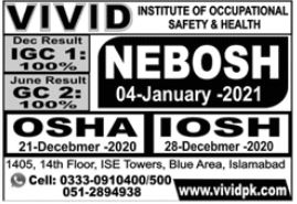 The VIVID Institute of Occupational Safety & Health has announced admissions for courses and diploma in NEBOSH, OSHA and IOSH in Islamabad Pakistan 2021. Read newspaper ad for exact details.