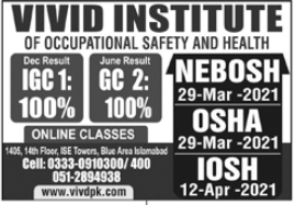 VIVID Institute of Occupational Safety & Health has announced admissions for diploma and courses in NEBOSH Health & Safety, OSHA & IOSH in Islamabad Pakistan 2021. Read newspaper ad for exact details.