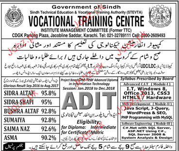 Vocational Training Center Admission in ADIT Advance Diploma in Information Technology, Advance IT Windows, Office 2013, JAVA Script, Word Press, PHP Programming in Karachi. Read newspaper ad for exact details.