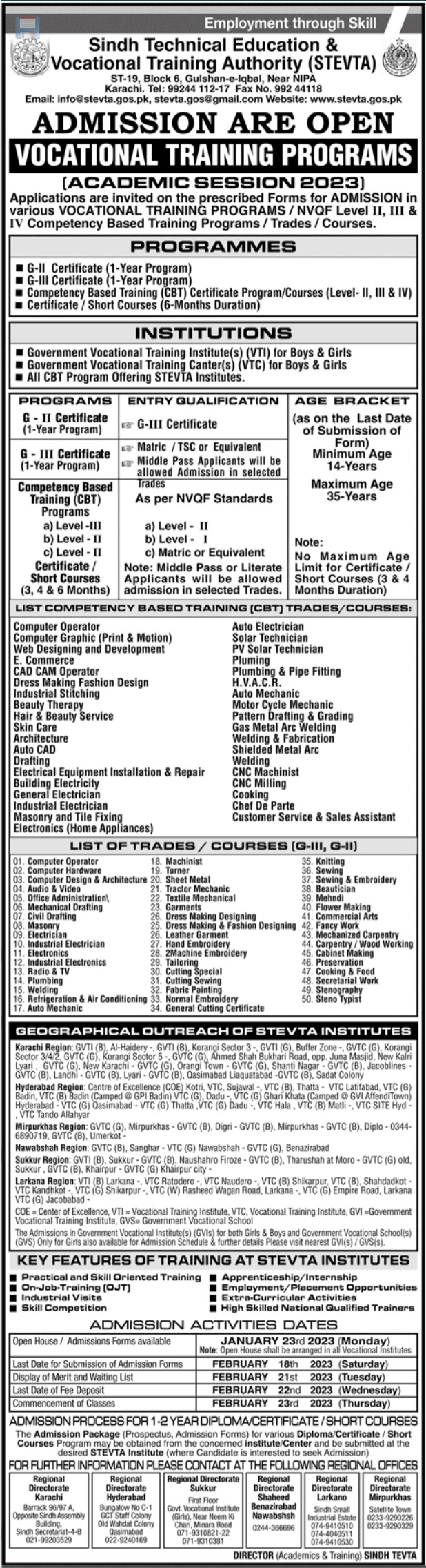 Admissions in Sindh Technical Education and Vocational Training Authority STEVTA 2023 for G II Certificate, G-III Certificate, Computer Operator, Computer Graphic, Web Designing and Development, E Commerce, CAD CAM Operator, Dress Making Fashion Design, Industrial Stitching, Beauty Therapy, Hair and Beauty Service, has been announced. Students can enroll for admissions in Sindh Technical Education and Vocational Training Authority STEVTA Karachi Sukkur, Nawabshah, Larkana, Hyderabad, and Mirpur Khas Sindh Pakistan for academic year 2023 to continue campus based or online education in Management College. Students who want to enroll for academic session 2023 in Course qualification and admission criteria for Government institute can apply till last date 18 February 2023. Read newspaper ad for exact details.