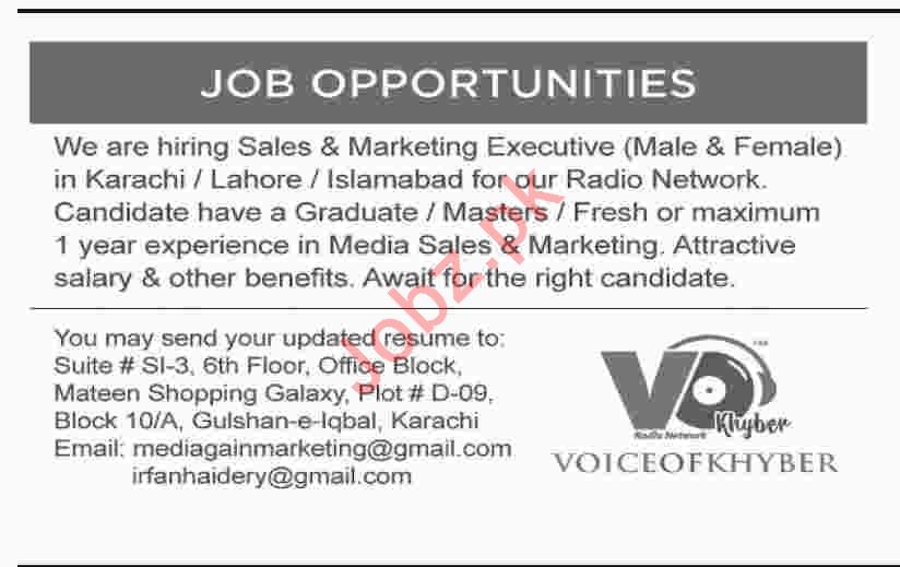 Voice Of Khyber Sales & Marketing Executive Jobs 2019