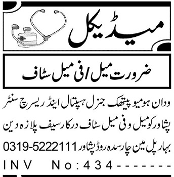Wadan Homeopathic General Hospital & Research Centre jobs advertisement dated about 1 October 2024 in daily Aaj Newspaper invites application for the vacant post of paramedical staff, office staff and female office staff in Peshawar, peshawar Khyber Pakhtunkhwa KPK Pakistan. Preferred Education is BA, Intermediate and Bachelor etc.