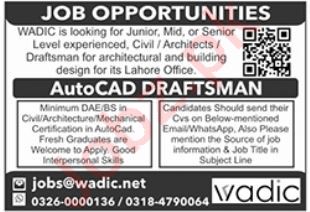Web Application and Data Integration Company WADIC Lahore, lahore Punjab Pakistan invites applications from eligible candidates for the post of autocad draftsman as per advertisement of April 2, 2023 published in daily Jang Newspaper. Preferred Education is Bachelor and DAE etc.