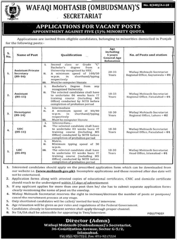 Vacancies in Wafaqi Mohtasib Ombudsman Secretariat Advertisement May 2022