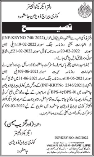 Kotri Barrage Division Jamshoro, jamshoro Sindh Pakistan invites applications from eligible candidates for the post of Sweeper, Khansama, Naib Qasid, Gauge Reader, Cook, bhishti, regulation beldar, Driver and Malhi as per advertisement of February 27, 2022 published in daily Jang Newspaper. Preferred Education is etc.