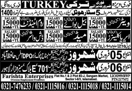 Farishta Enterprises Oversea Employment Promoters jobs advertisement dated about 1 February 2024 in daily Express Newspaper invites application for the vacant post of dish washer, room attendant, waiter, maid, bell boy and area cleaner in Istanbul, istanbul Turkey. Preferred Education is Intermediate, Matric, Middle and Bachelor etc.