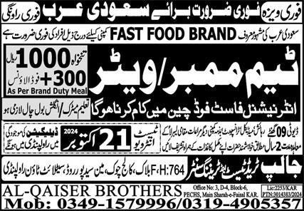Al Qaiser Brothers Saudi Arabia, saudi arabia Saudi Arabia invites applications from eligible candidates for the post of waiter and team member as per advertisement of October 19, 2024 published in daily Express Newspaper. Persons with Middle, Matric and Intermediate etc. education can apply.