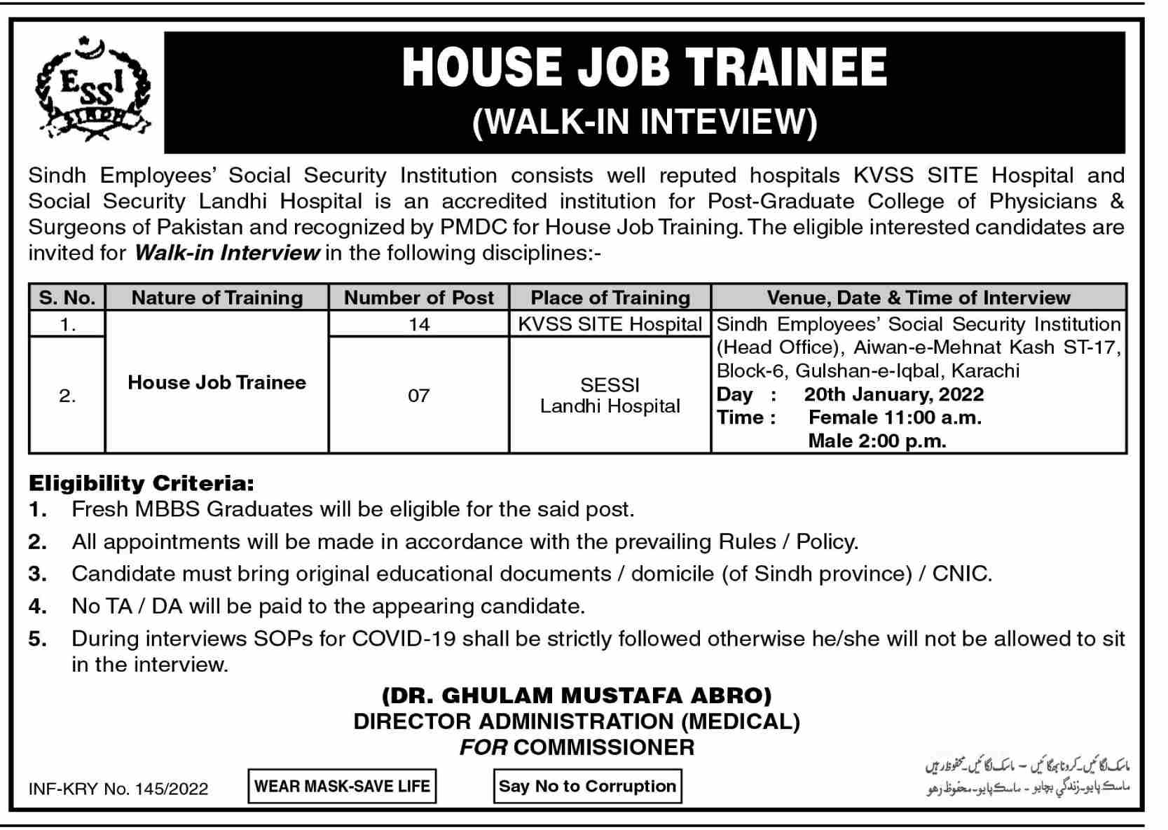 Vacancies in Social Security Landhi Hospital Advertisement January 2022