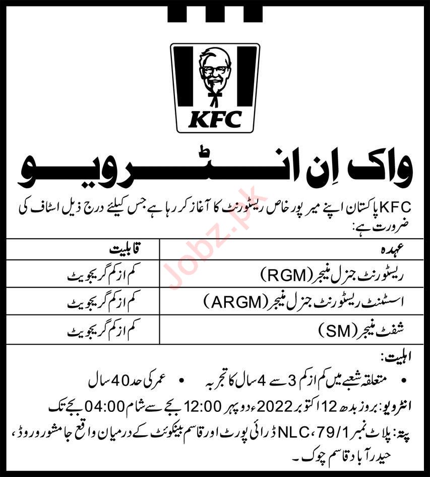 Vacant posts including assistant restaurant general manager, restaurant general manager and shift manager are announced in KFC Pakistan Hyderabad, hyderabad Sindh Pakistan as per 10 October 2022 advertisement in daily Express Newspaper. Preferred Education is Bachelor etc.