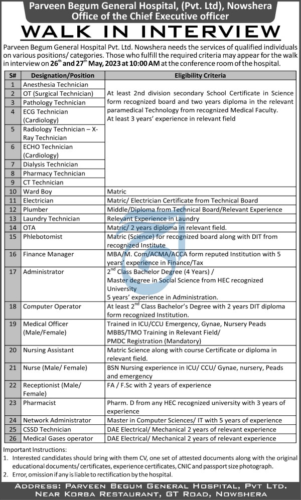 Vacant posts including dialysis technician, nurse, plumber, nursing assistant, cssd technician, computer operator, receptionist, anesthesia technician, ct technician, xray technician, operation theatre assistant ota, ot technician, radiology technician, finance manager, pathology technician, network administrator, echo technician cardiology, ward boy, laundry technician, surgical technician, phlebotomist, ecg technician cardiology, medical gases operator, administrator, medical officer, pharmacist, electrician and pharmacy technician are announced in Parveen Begum General Hospital Nowshera, nowshera Khyber Pakhtunkhwa KPK Pakistan as per 19 May 2023 advertisement in daily Aaj Newspaper. MBA, Intermediate, Master, Matric, M.com, ACCA, MIT, MBBS, Pharma D, DAE, Bachelor and MCS etc. educational qualification will be preferred.