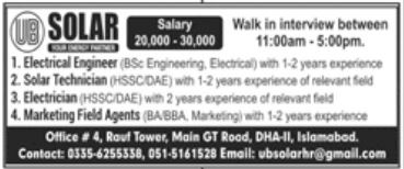 UB Solar Company invites applications for job positions advertised in daily Jang dated 27 March 2022 for following vacancies in Islamabad, islamabad Islamabad Pakistan.