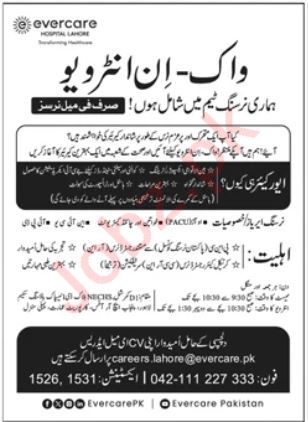 Vacant posts including nursing team are announced in Evercare Hospital Lahore Nespak Housing Scheme Lahore, lahore Punjab Pakistan as per 9 March 2025 advertisement in daily Jang Newspaper. Candidates with Others and Intermediate etc. educational background will be preferred.