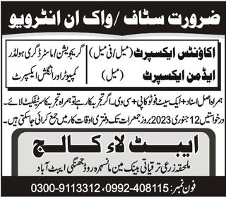 Abbott Law College Abbottabad, abbottabad Khyber Pakhtunkhwa KPK Pakistan invites applications from eligible candidates for the post of accounts expert and male admin expert as per advertisement of January 10, 2023 published in daily Aaj Newspaper. Bachelor and Master etc. educational qualification will be preferred.
