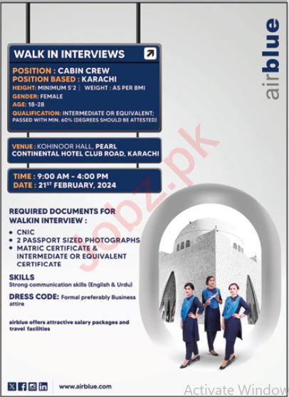 Airblue Karachi, karachi Sindh Pakistan invites applications from eligible candidates for the post of cabin crew as per advertisement of February 18, 2024 published in daily Jang Newspaper. Intermediate etc. educational qualification will be preferred.