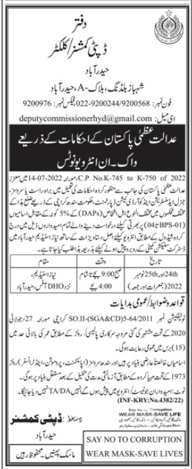Deputy Commissioner Office Hyderabad, hyderabad Sindh Pakistan invites applications from eligible candidates for the post of class iv staff as per advertisement of November 21, 2022 published in daily Jang Newspaper. Candidates with Primary and Middle etc. educational background will be preferred.