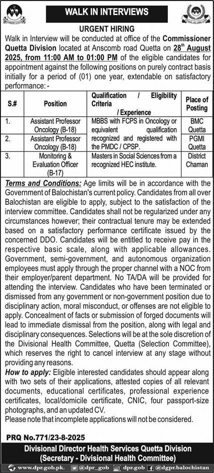 Director Health Services Quetta, quetta Balochistan Pakistan invites applications from eligible candidates for the post of assistant professor oncology and monitoring evaluation officer as per advertisement of August 24, 2025 published in daily Express Newspaper. Master and MBBS etc. educational qualification will be preferred.