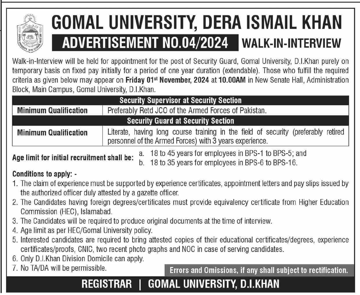 Gomal University jobs advertisement dated about 29 October 2024 in daily Dawn Newspaper invites application for the vacant post of security guard and security supervisor in Dera Ismail Khan, dera ismail khan Khyber Pakhtunkhwa KPK Pakistan. Educational qualifications required Bachelor, Middle and Intermediate etc.