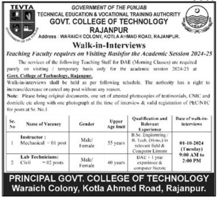 Vacant posts including instructor mechanical, lab technician civil and instructor are announced in Technical Education & Vocational Training Authority TEVTA Rajanpur, rajanpur Punjab Pakistan as per 24 September 2024 advertisement in daily Khabrain Newspaper. Persons with DAE, Bachelor and B.E etc. education can apply.