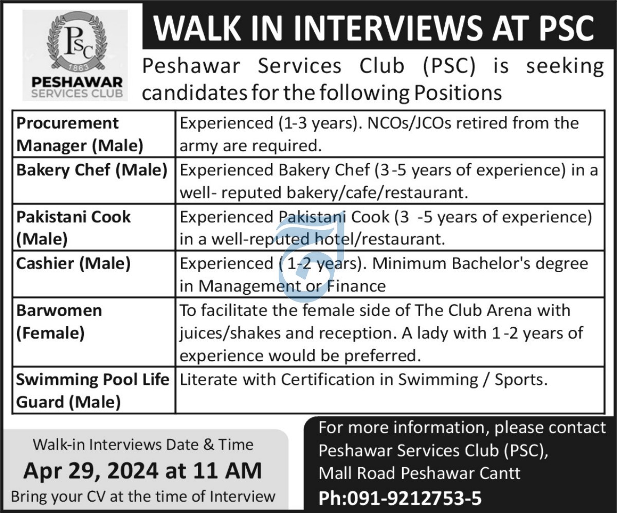 Vacancies in Peshawar Services Club Advertisement April 2024