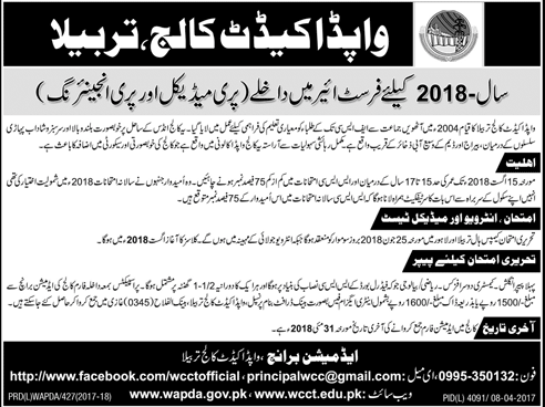 WAPDA Cadet College Tarbela Admission in Class XI Pre Medical / Pre Engineering in Tarbela. Admission Session 2018-2019. Admission Test will be held on 25-06-2018. Read newspaper ad for exact details.