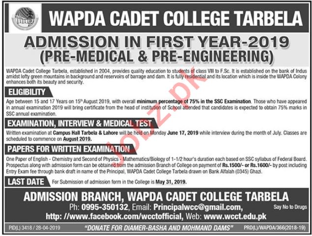 Wapda Cadet College Tarbela has announced admissions 2019-2020 for Fsc Pre Engineering, Fsc Pre Medical in Tarbela. All Student may submit their admission form before last date. Read newspaper ad for exact details.