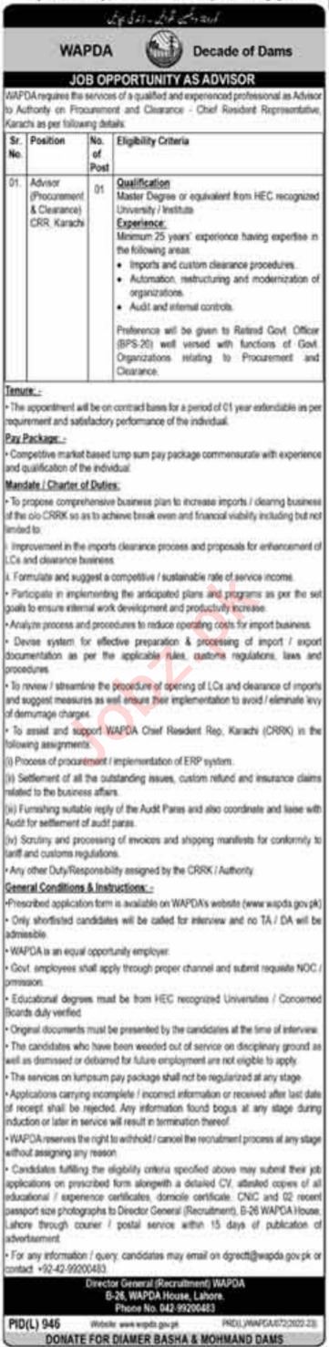 WAPDA Karachi Jobs 2022 for Advisor