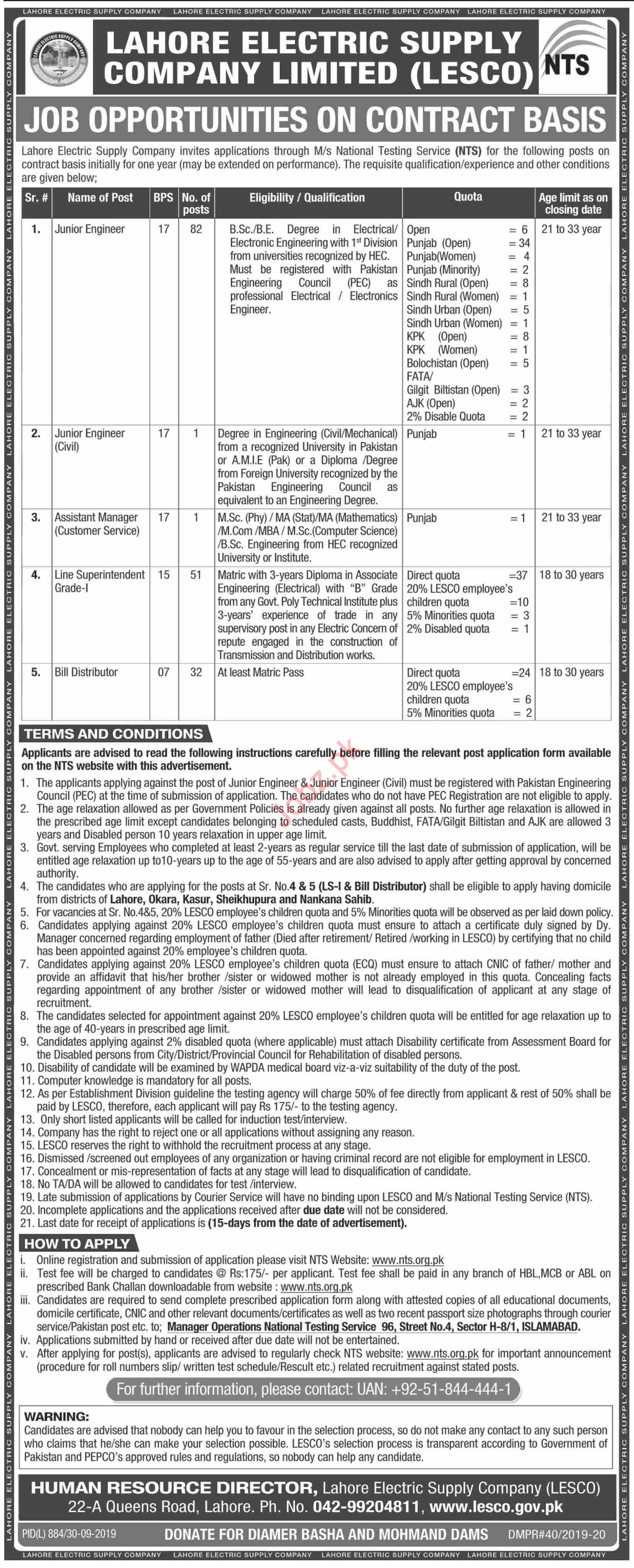 Vacancies in Lahore Electric Supply Company LESCO Advertisement September 2019