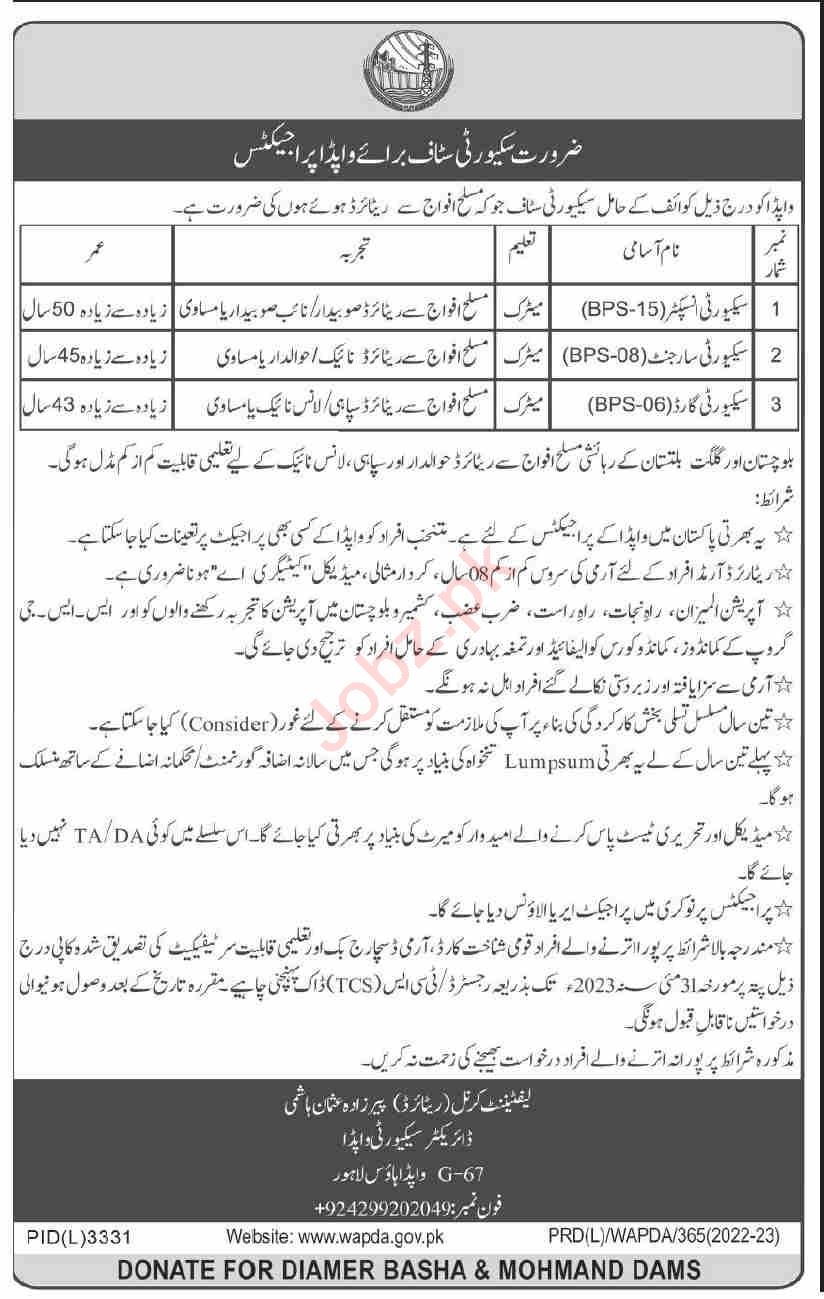 Water and Power Development Authority WAPDA jobs advertisement dated about 21 May 2023 in daily Dawn Newspaper invites application for the vacant post of security sargent, security inspector and security guard in Lahore, lahore Punjab Pakistan. Middle and Matric etc. educational qualification will be preferred.