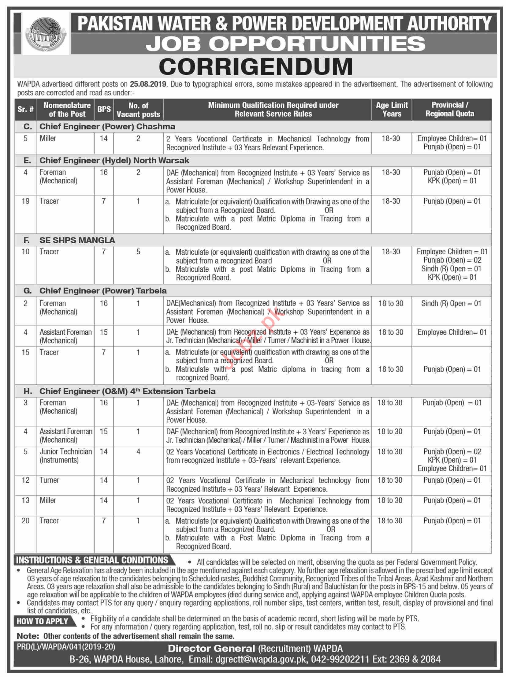 Vacancies in Water and Power Development Authority WAPDA Advertisement August 2019