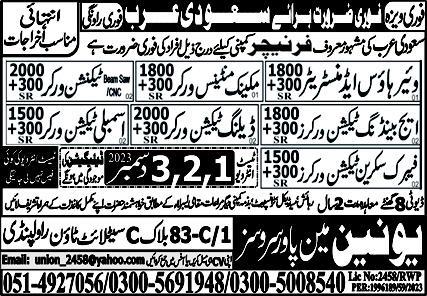 Union Manpower Services jobs advertisement dated about 29 November 2023 in daily Express Newspaper invites application for the vacant post of warehouse administrator, edge bending technician worker, assembly technician worker, maintenance worker, technician worker, dealing technician worker and fabric screen technician worker in Dammam, jeddah Saudi Arabia. Intermediate, DAE and Matric etc. educational qualification will be preferred.
