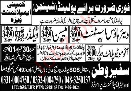 Safeer E Watan Overseas Employment Promoters is looking for candidates for following posts as per job advertisement published in daily Express Newspaper of September 29, 2024 for location Warsaw, warsaw Poland: