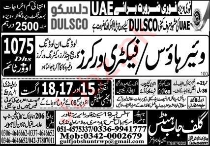 Vacant posts including warehouse worker and factory worker are announced in Gulf Job Hunts Manpower Services UAE, uae UAE as per 13 August 2023 advertisement in daily Express Newspaper. Matric, Middle and Intermediate etc. educational qualification will be preferred.