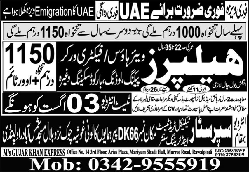 Super Star Technical Trade Test & Training Center invites applications for job positions advertised in daily Express dated 1 August 2024 for following vacancies in Abu Dhabi, sharjah UAE.