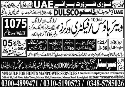 Vacant posts including factory worker and warehouse worker are announced in MS Gulf Job Hunts Manpower Services OEP Abu Dhabi, abu dhabi UAE as per 3 August 2023 advertisement in daily Express Newspaper. Candidates with Middle etc. educational background will be preferred.